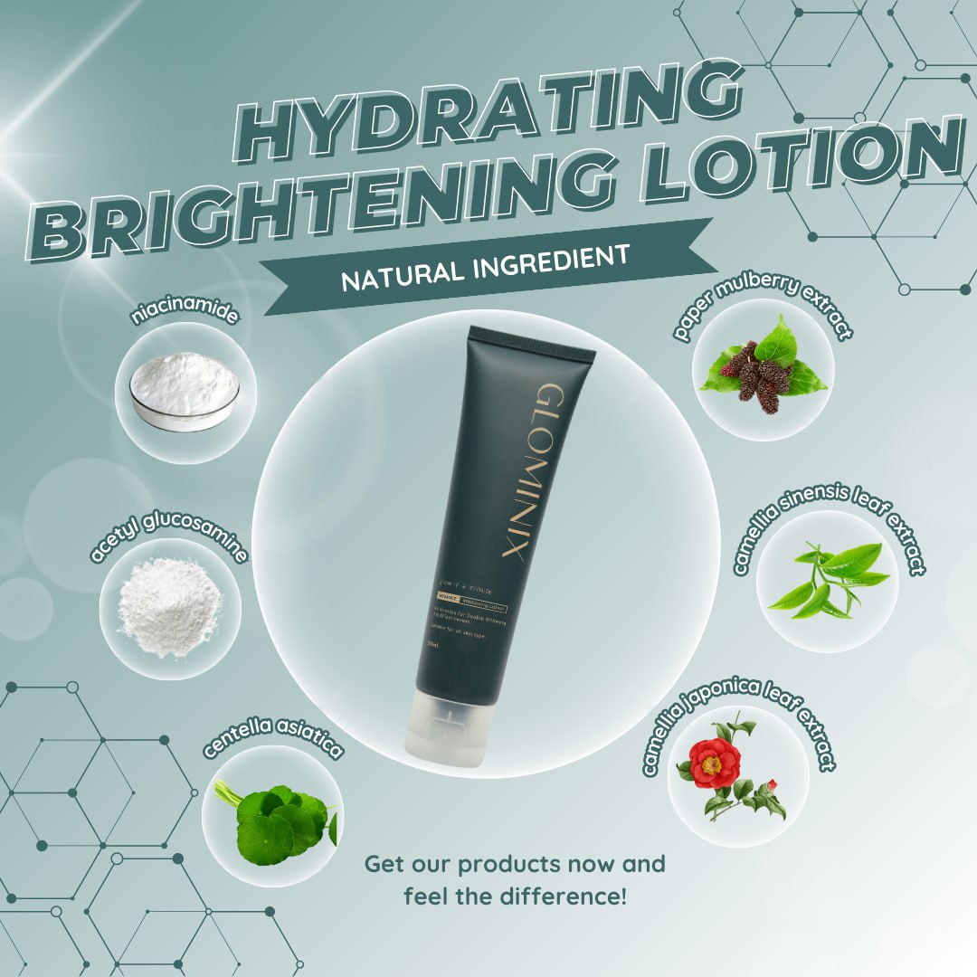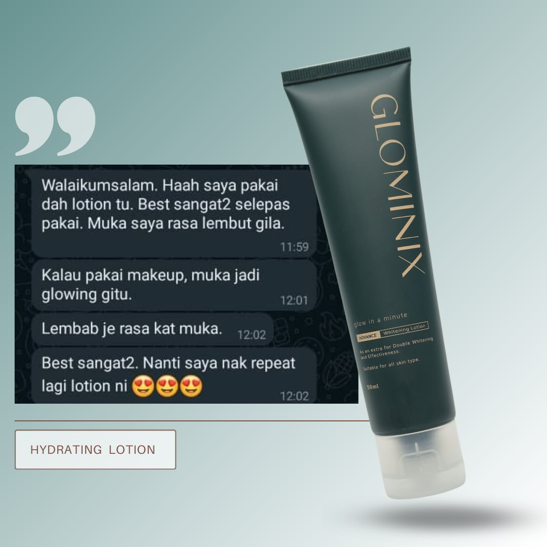 Bukan hanya untuk mencerahkan kulit, malah boleh melembabkan kulit serta banyak kelebihan-kelebihan lain yang boleh didapatkan dalam Glominix Lotion ni.
