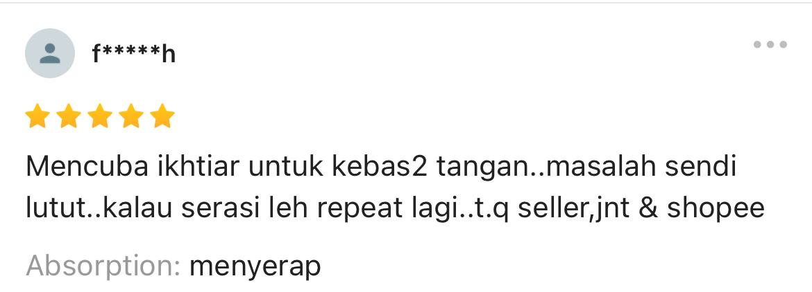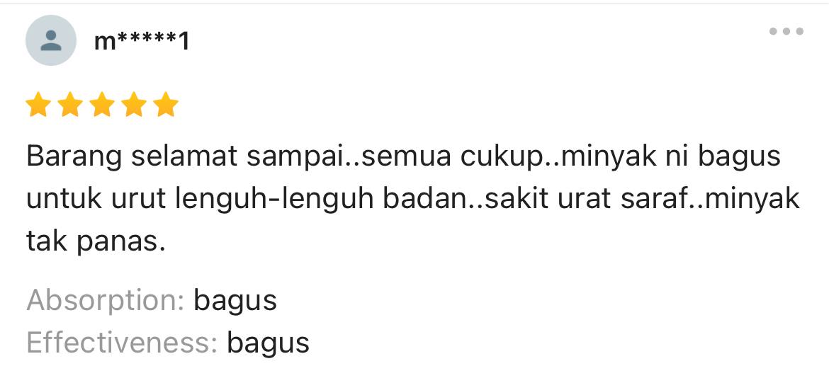 " Minyak rasa sejuk je.Tak Panas. Sedap guna. sapu-sapu je terus rasa lega "