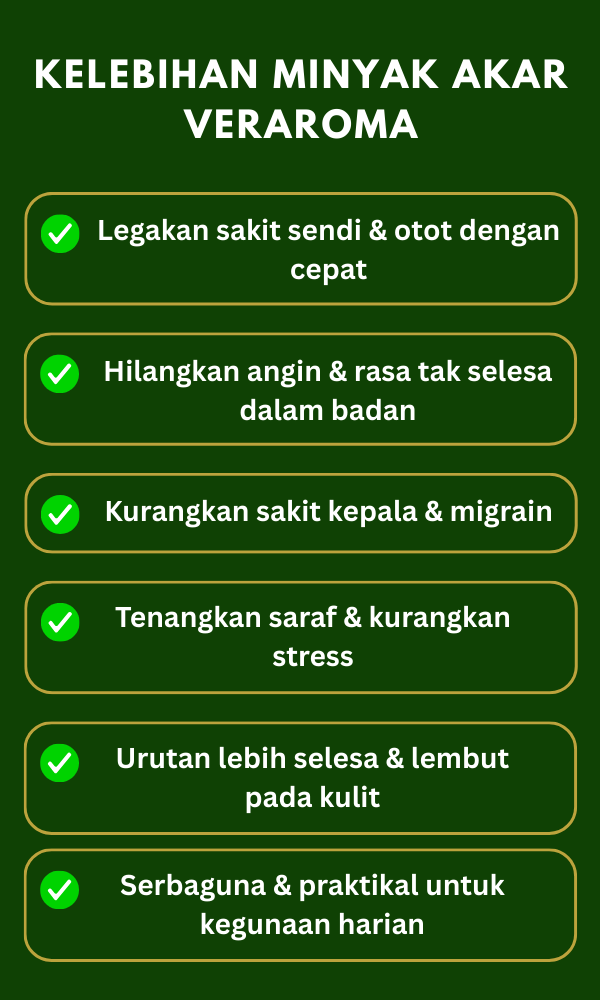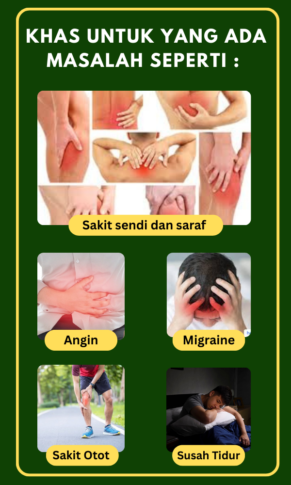 Minyak Akar sesuai untuk dewasa & warga emas. Boleh digunakan oleh lelaki atau wanita yang selalu alami lenguh badan, sakit sendi, angin, migrain atau stress.